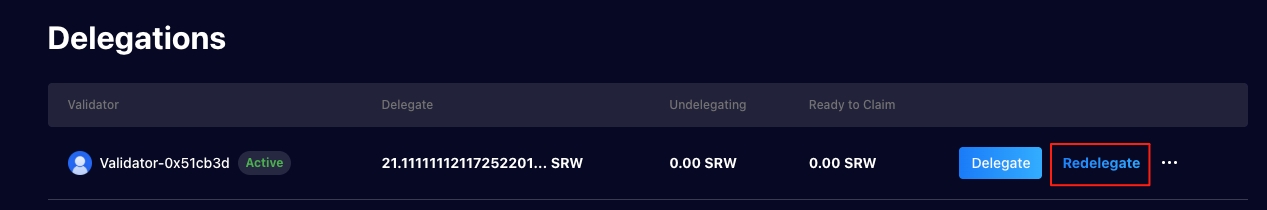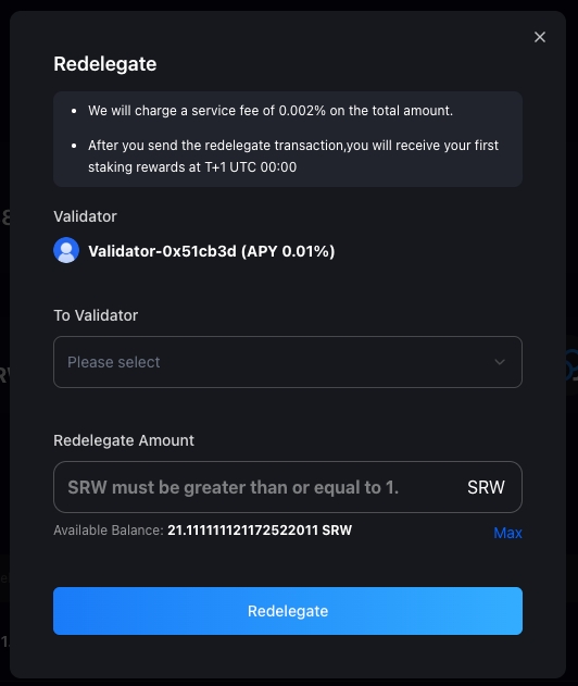 In the ensuing popup, select your new validator and specify the amount to redelegate. You can opt to move the entire amount or just a portion.