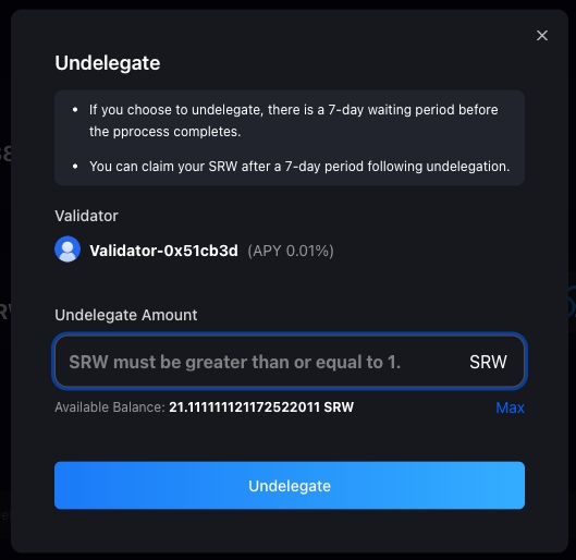 You can choose to undelegate the entire amount or a portion. Note that undelegated stakes are subject to a 7-day unbonding period before they are returned to your account.